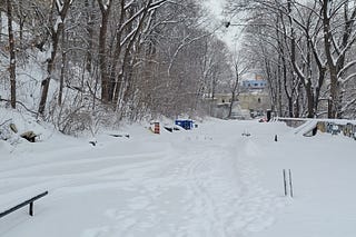 IMAGE DESCRIPTION: the old abandoned road/DIY skateboard park covered in snow and framed by trees with bare branches, also snow-covered.