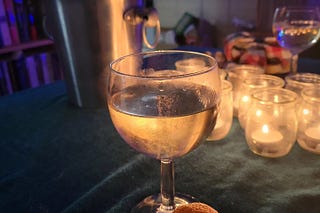 IMAGE DESCRIPTION: glass of sparkling wine, clementine with another glass, small tea candles and an ice bucket with a bottle of sparkling wine in it.