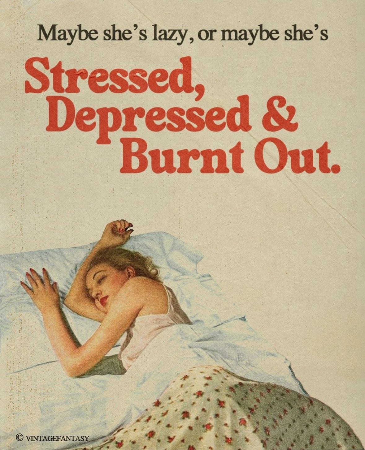 Image Description: a woman lies on a bed. TEXT in red: maybe she’s lazy or maybe she’s stressed, depressed & burnt out. © VintageFantasy.