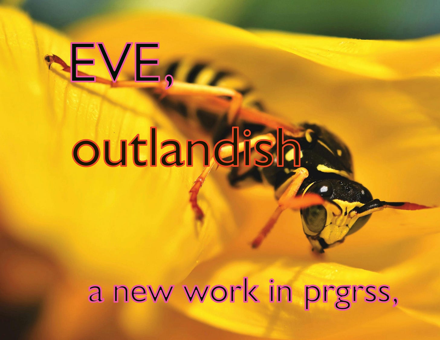 IMAGE DESCRIPTION: Text in black, outlined in pink and orange. EVE, outlandish. a new work in prgrss. PHOTO: a close up of what i think is a wasp or hornet on a yellow leaf. Photo credit: Affinity Photo: Ralph.